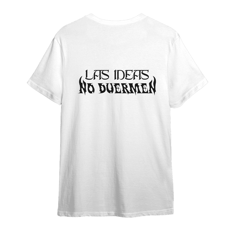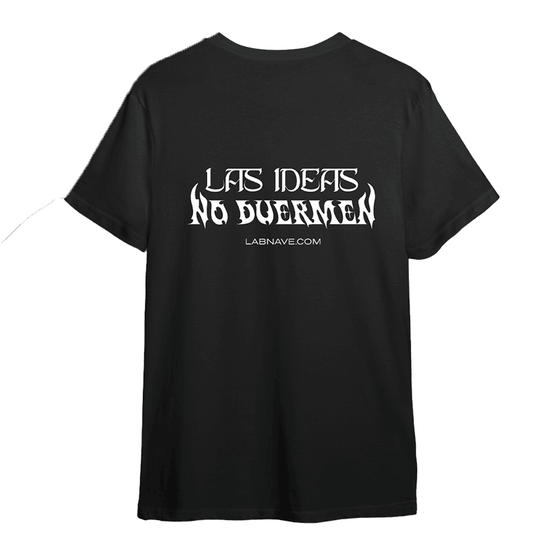 El frente lleva el símbolo orbital de LAB NAVE, y en la espalda la frase que resume la vida creativa: Las ideas no duermen.
